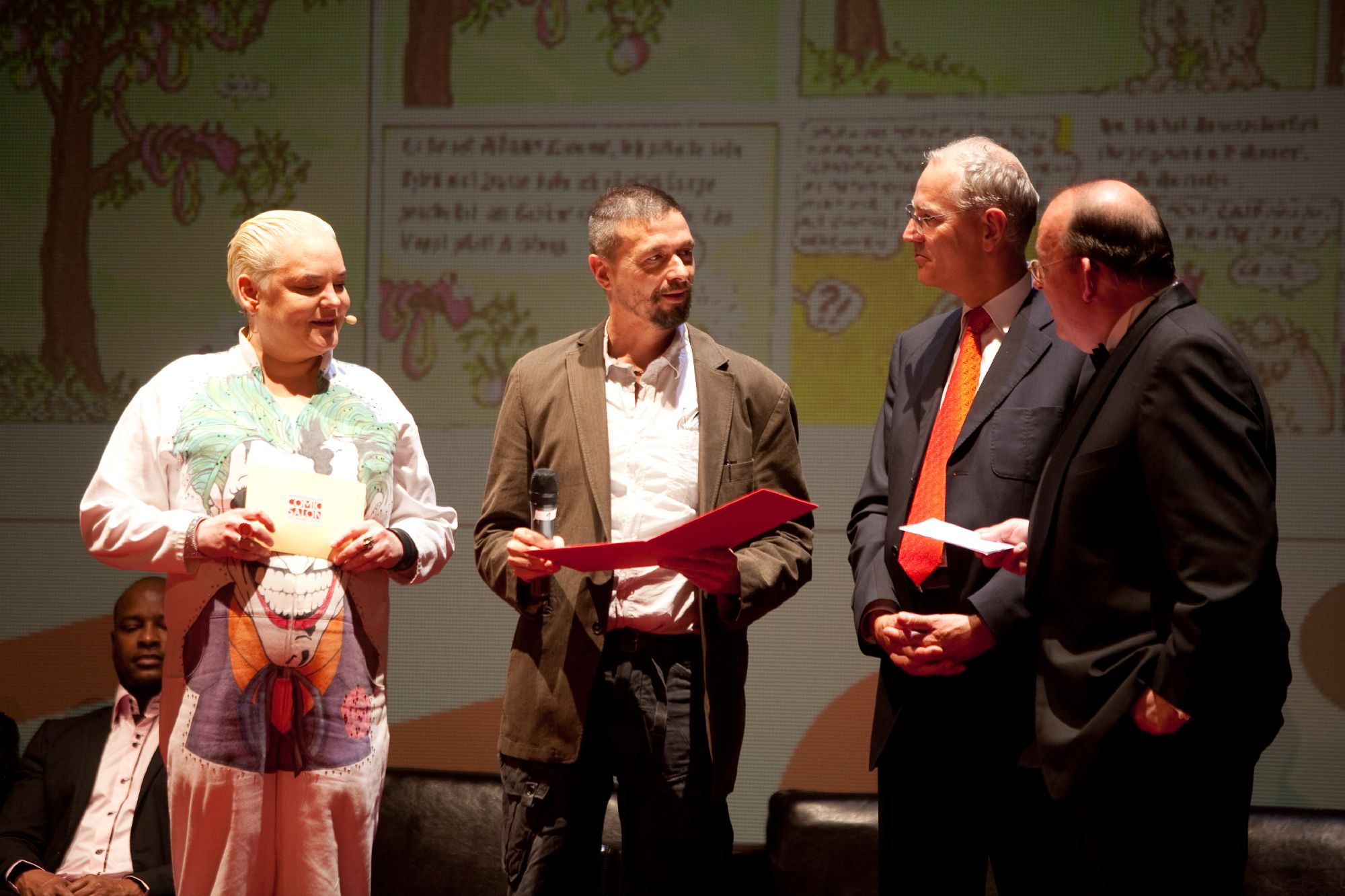 Hella von Sinnen, Ralf König, Dr. Siegfried Balleis (Oberbürgermeister der Stadt Erlangen) und Denis Scheck Copyright: Internationaler Comic-Salon Erlangen – Foto: Erich Malter, 2010
