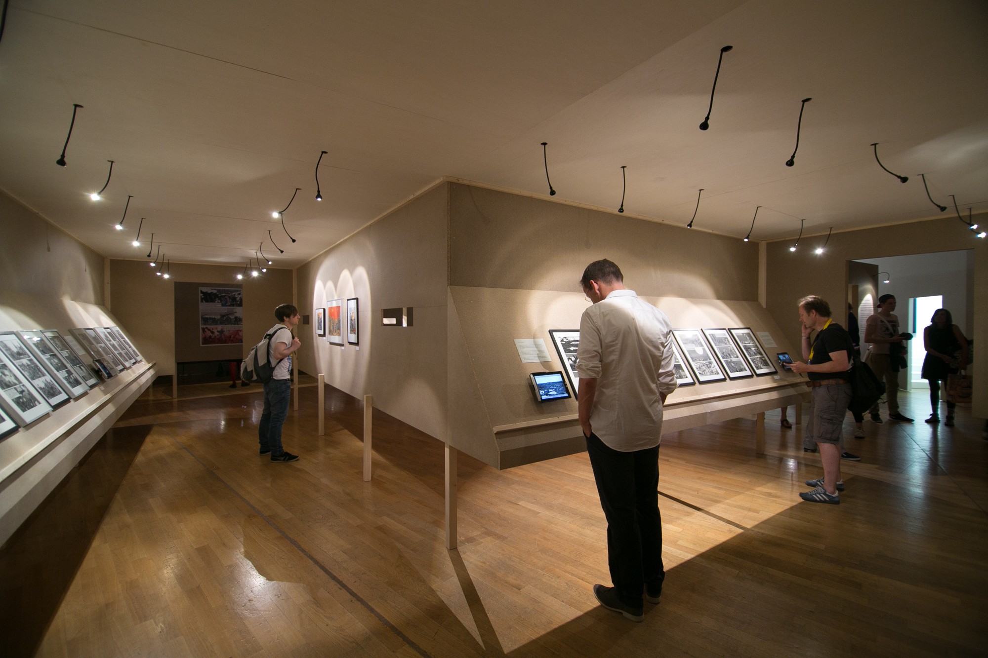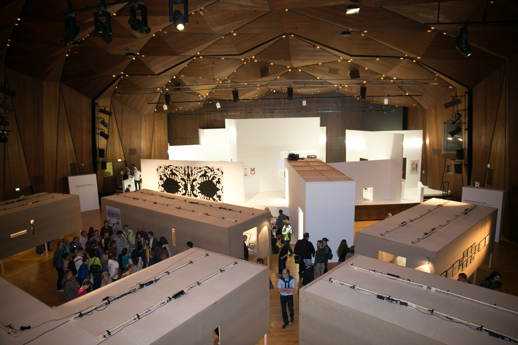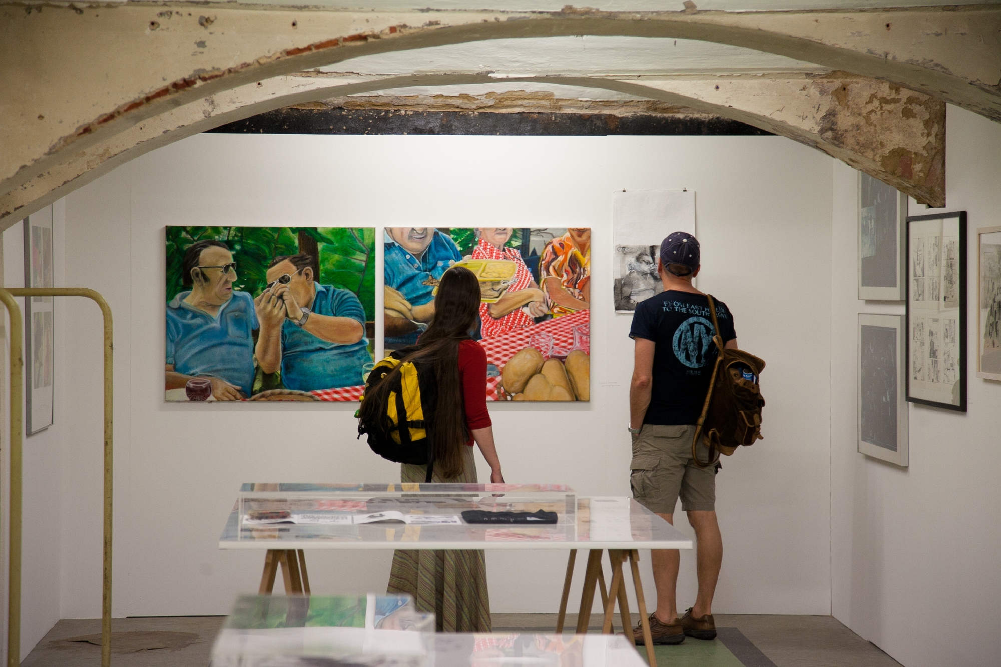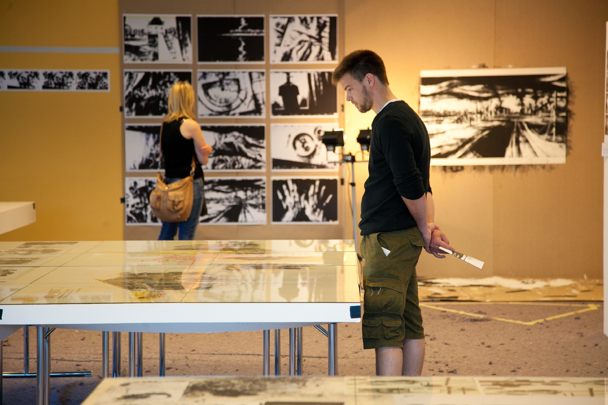 Blick von der Empore auf die Ausstellungen „Landschaft des Todes – Jacques Tardi und der Erste Weltkrieg" (vorne) und „Sommer, Herbst und weiter – 10 Jahre Künstlerinnenmagazin SPRING“ (hinten) im Großen Saal der Heinrich-Lades-Halle