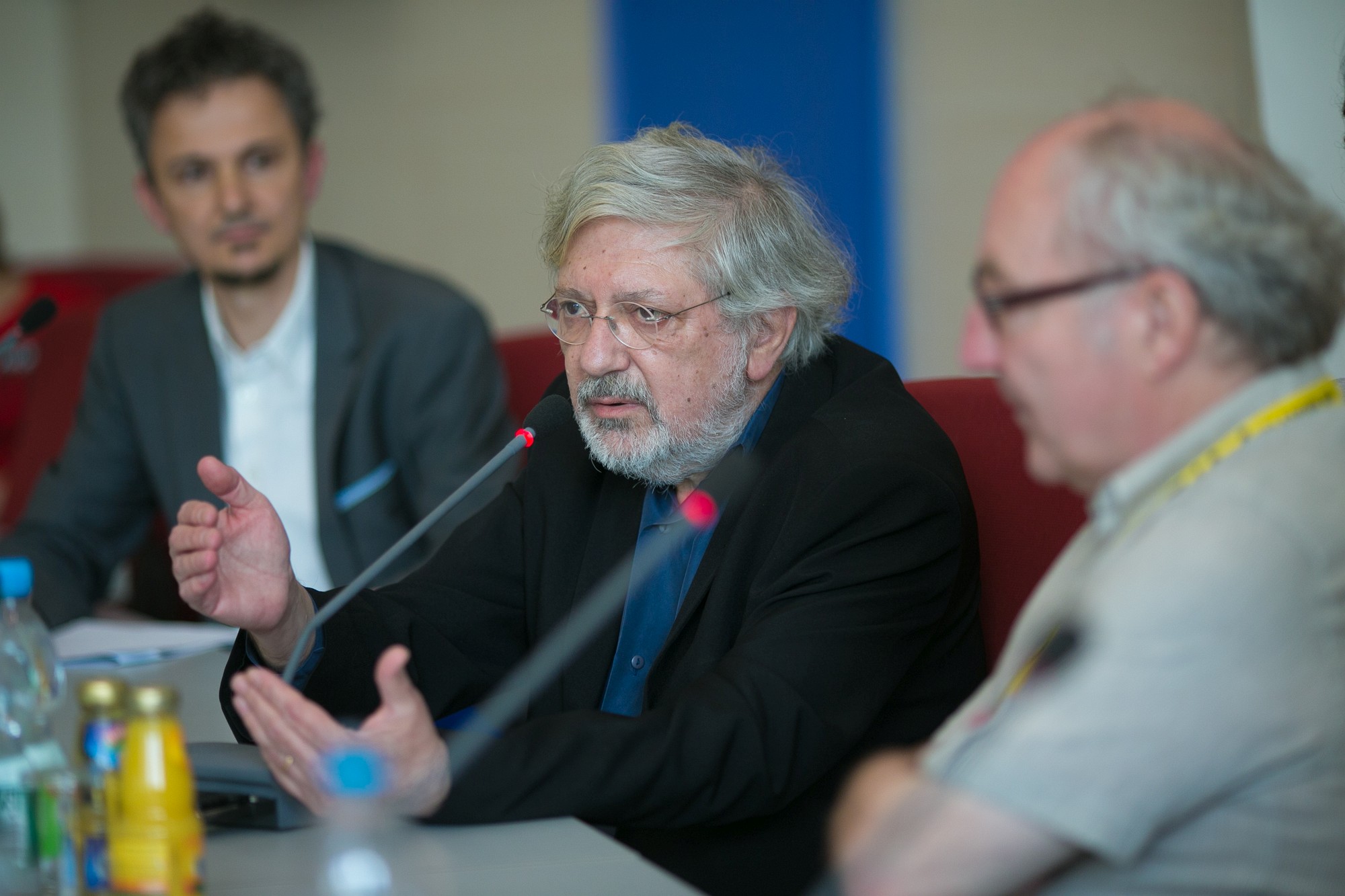 Hans-Diether Dörfler (links) im Gespräch mit Jacques Tardi und Jean-Pierre Verney (Historiker, rechts)